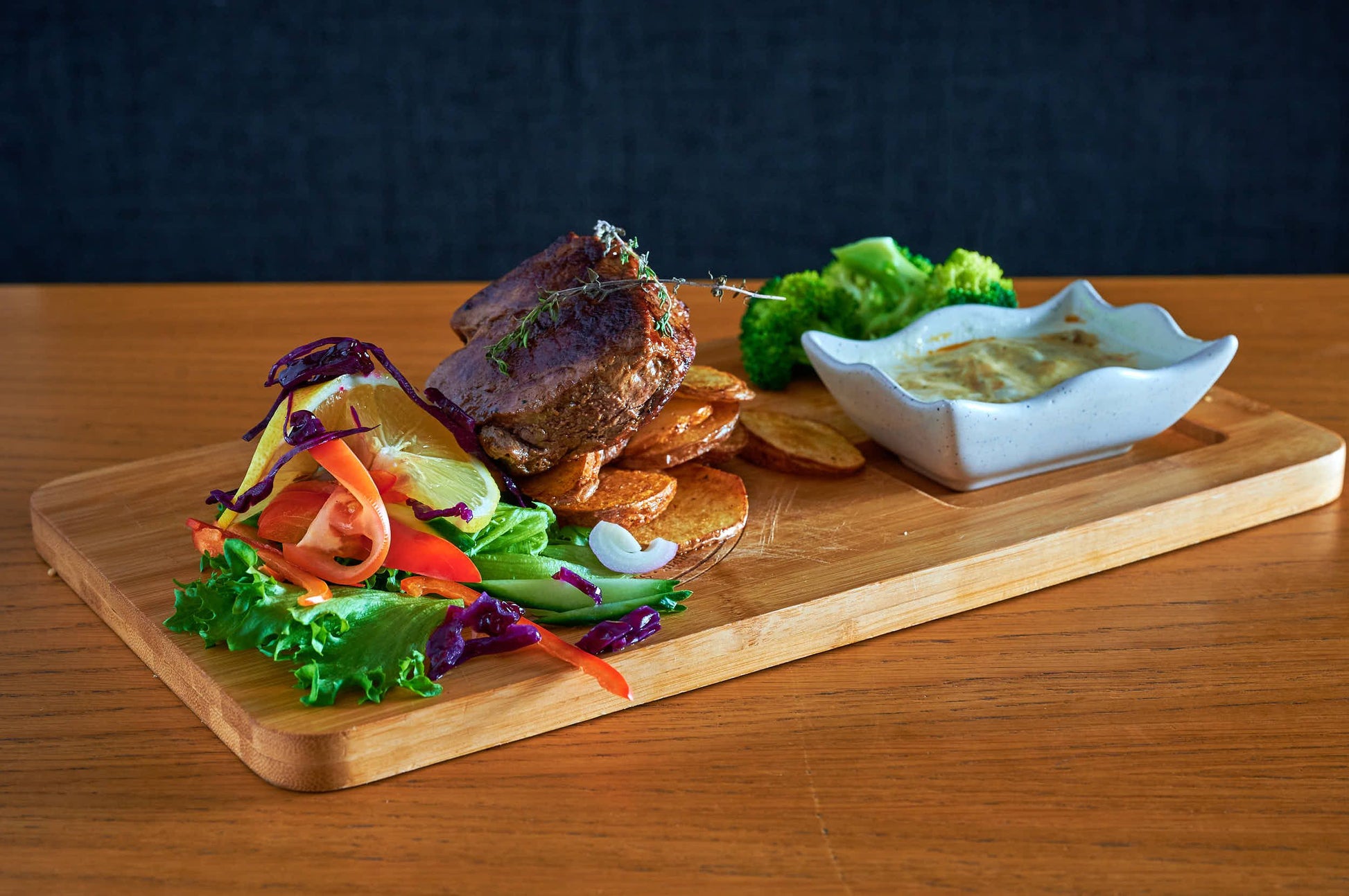 Grillet indrefilet 200g med grønnsaker, stekte poteter og peppersaus. Serveres med salat.