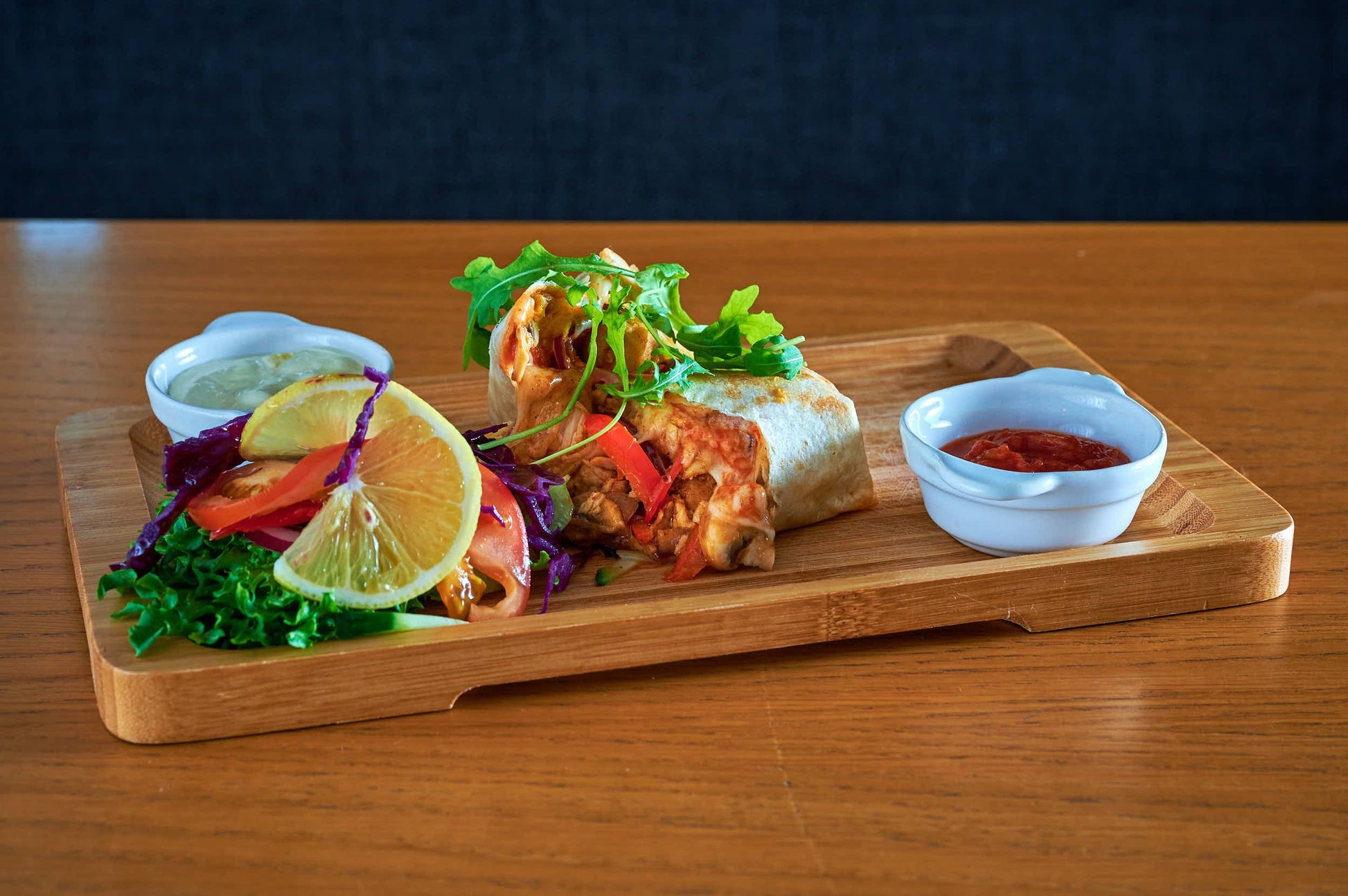 Gratinert burrito med kyllinfilet, grønnsaker, salsa og hvitløkssaus.