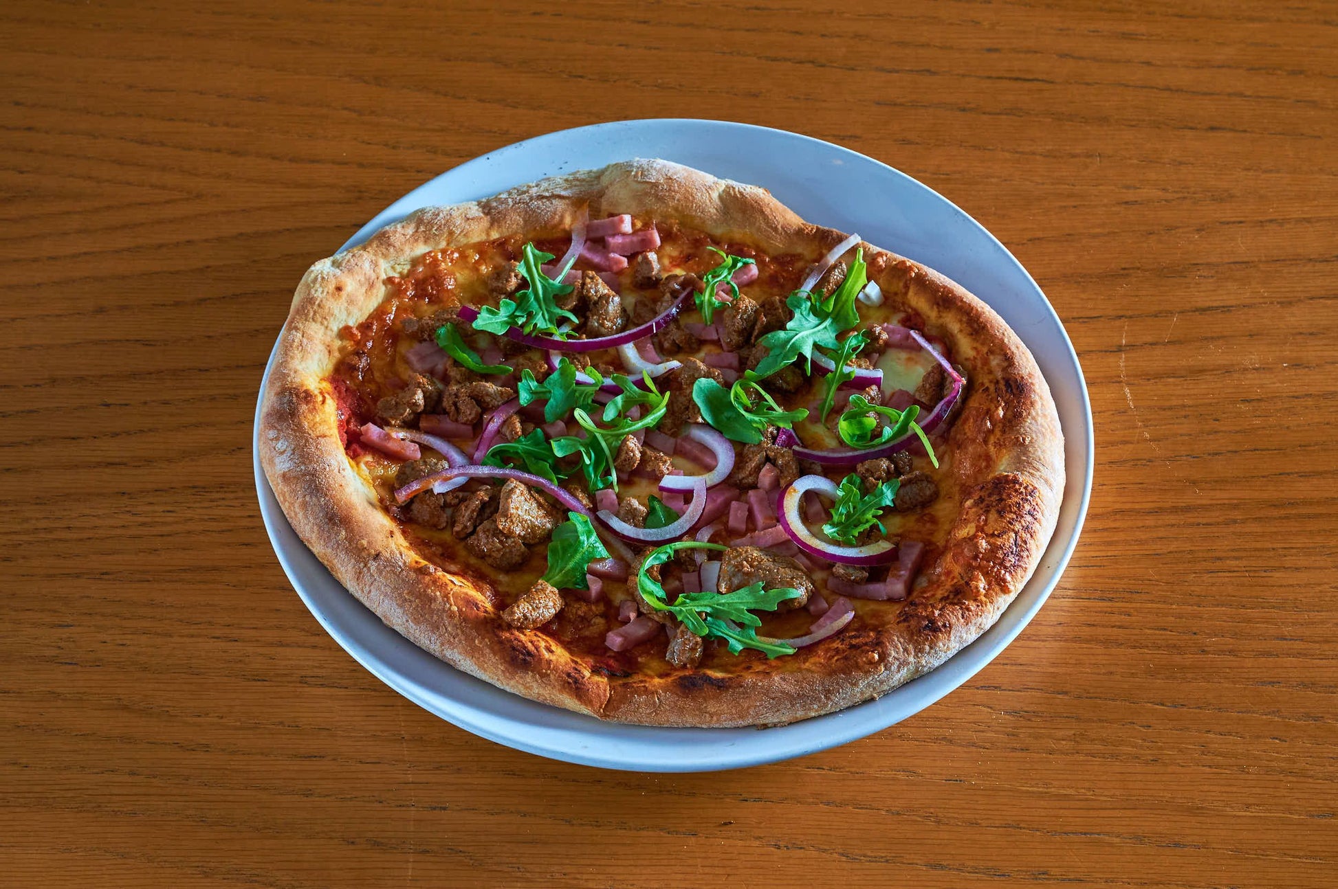 Pizza med tomatsaus, ost, biff, skinke og løk.