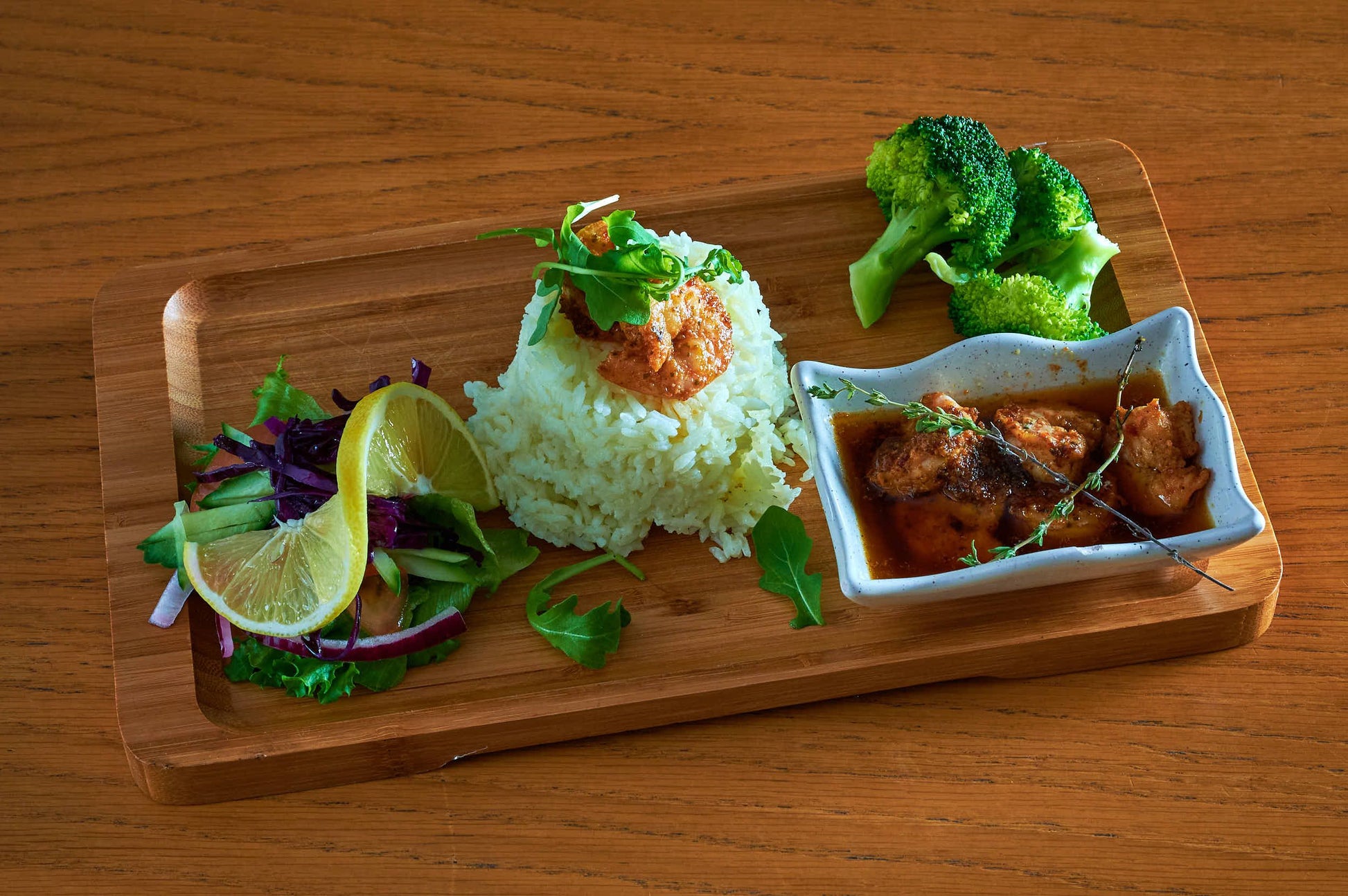 Scampi med hvitløk, grønnsaker, ris og salat.